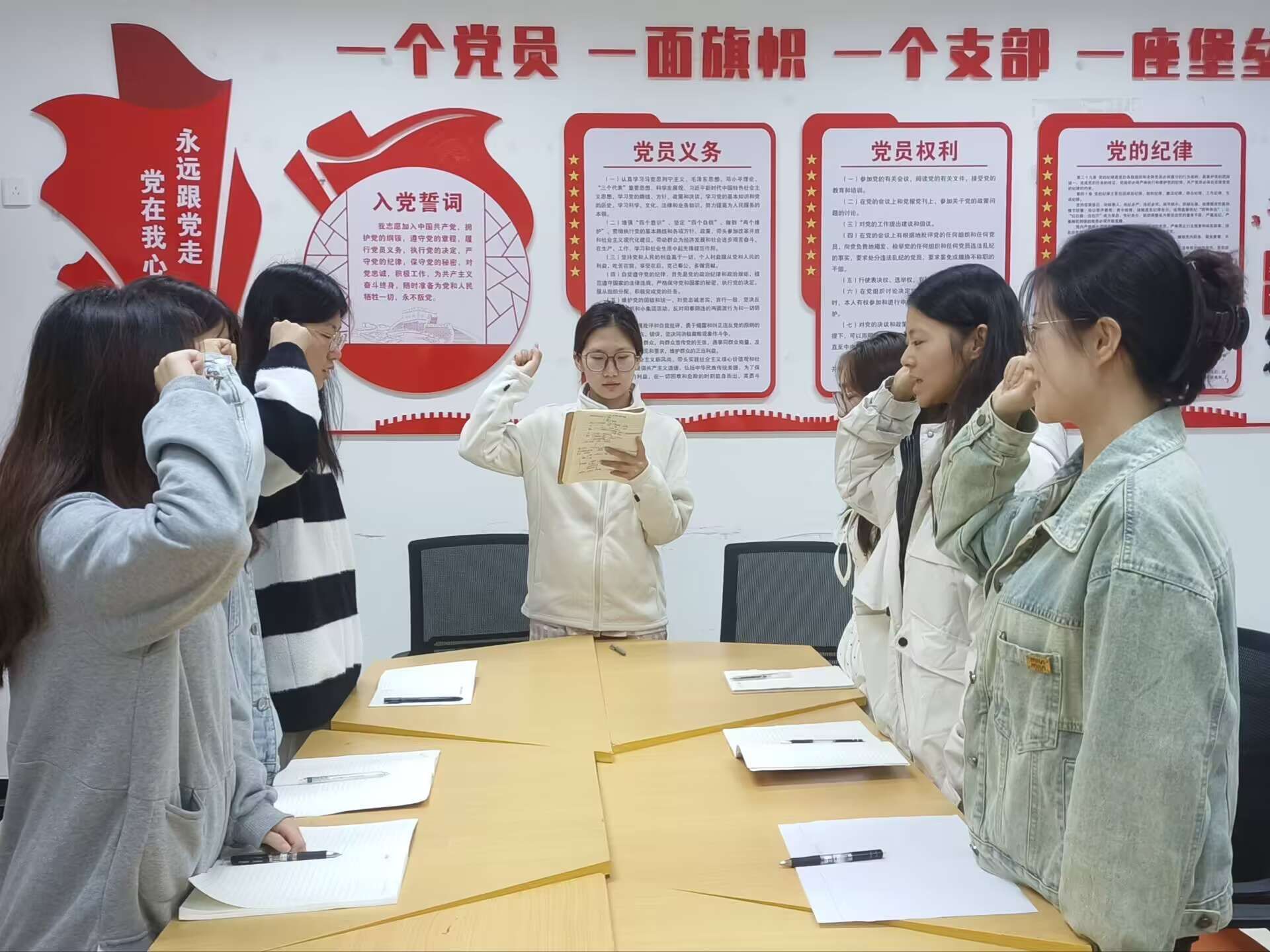 以党的二十大精神为指引,护理专升本2421团支部用一场庄严仪式为青年学子拉开信仰践行之旅的序幕。“永远跟党走”文化墙前,团支书带领全体团干部高举右拳,入团誓词铿锵有力,与墙上“党员义务”的指引交相辉映。誓词落定后,班委们将仪式里的热忱,与护理专业“护佑生命”的使命联结——既深化了理论学习的思想内核,也让青春力量转化为服务班级、践行专业初心的实际动力。