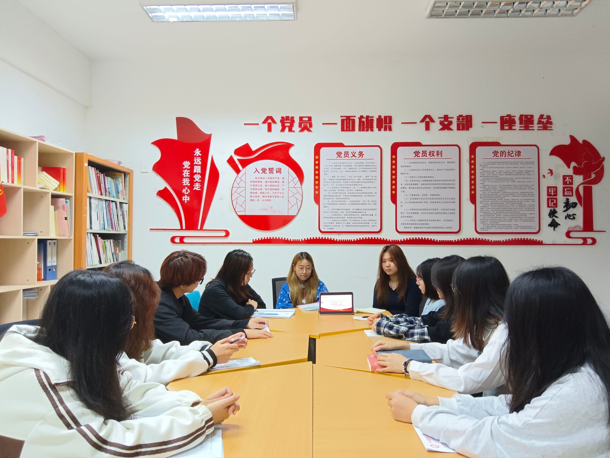 “一个党员一面旗帜” 的党建标语熠熠生辉,护理2325团支部以党的二十大精神为指引,结合班级实际,将理论学习与班委工作相融合:从“党员义务”中锚定服务同学的方向,从“不忘初心”标语里明确责任担当。红色信仰化作班委履职的动能,更为后续班级活动开展夯实了思想根基。