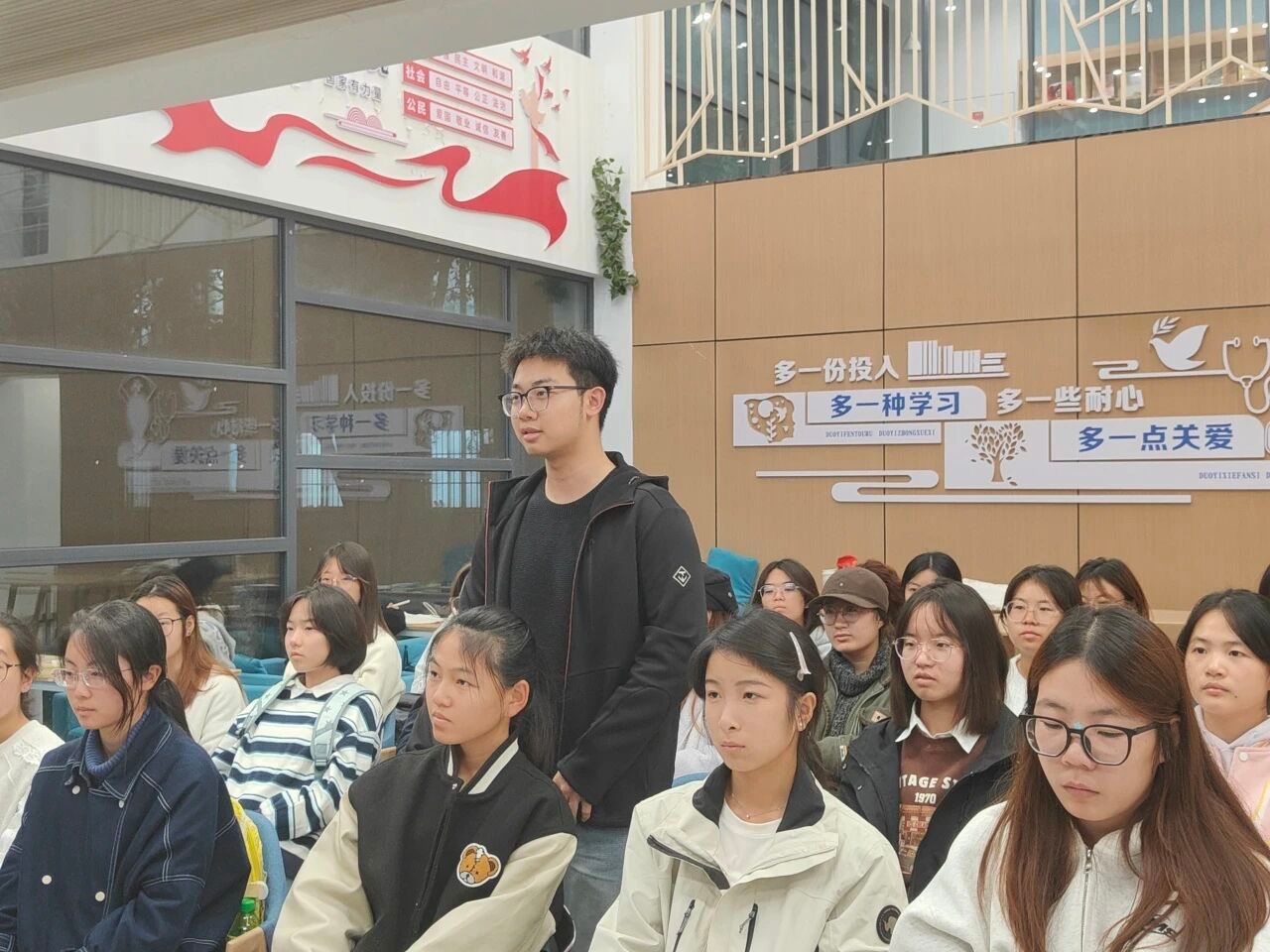 在交流讨论环节上,学院团总支学生副书记张悦、马甲一分别作专题辅导。张悦围绕党的二十届四中全会精神核心意义,结合“推进健康中国建设”“保障和改善民生”等重要部署,从人才培养、行业发展、社会服务等维度,深入阐释了全会精神对医药卫生领域青年的现实指导意义;马甲一则以“十五五”规划为切入点,聚焦“青年赋能高质量发展”现实,联系学院学科建设、实习就业等实际,解读“科技自立自强”“人才强国”部署与青年成长的内在联系,二位学生副书记鼓励同学们以专业践行使命,服务社会,为行业进步贡献青年力量。