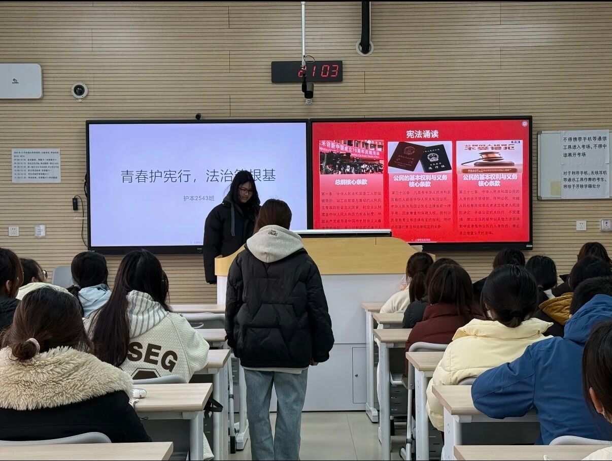 各团支部积极创新活动形式,将宪法学习教育融入实践环节,有效激发了团员的学习热情,进一步提升了青年学子法治意识。护理2536团支部举办 “宪法了解分享会”。团员通过分享宪法相关故事,在法治文化熏陶中明确了青年的时代责任、筑牢了法治信仰。活动最后,全体团员庄严宣誓,铿锵誓词彰显尊崇宪法、维护宪法的坚定决心。