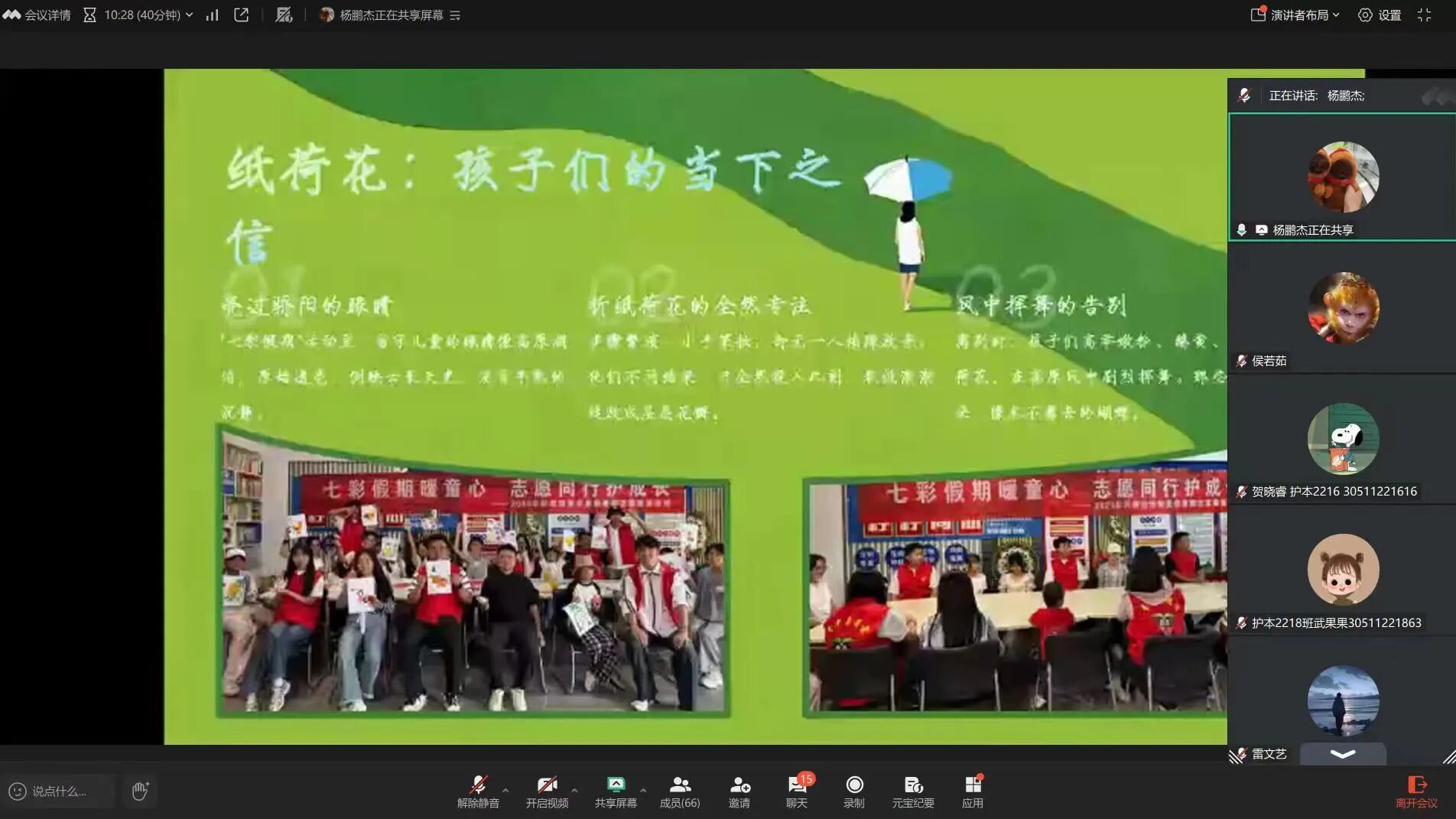 学长结合亲身经历,分享了三段触动人心的志愿故事:“七彩假期”活动中,他教留守儿童与残障儿童折纸绘画,孩子们澄澈如湖水的眼神、临别时挥舞纸荷花的不舍,定格成最温暖的记忆;走访慰问21岁被遣返的藏族女孩时,他感慨西部部分地区的发展困境与同龄人的境遇落差,更坚定了以微光暖大地的决心;雷锋月里,他以志愿者代表身份发声,在义诊与服务中体悟“奉献、友爱、互助、进步”的志愿真谛,懂得以微薄之力倾听苦难、伸出援手。
