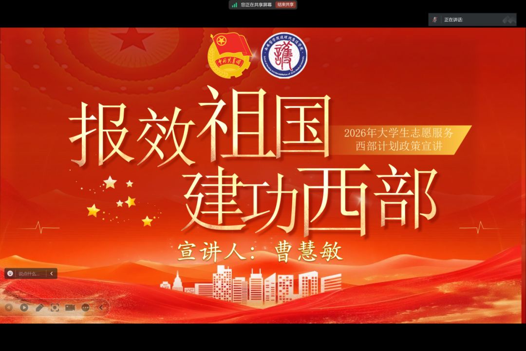 分享会尾声,曹慧敏深情寄语在场学子:西部计划不仅是奉献的平台,更是个人成长与自我探索的宝贵旅程。她鼓励同学们坚定理想信念、明确奋斗目标,跳出舒适区、拥抱大舞台,以青春之我、奋斗之我,投身西部、扎根基层,到祖国最需要的地方去,让青春在全面建设社会主义现代化国家的火热实践中绽放绚丽之花。