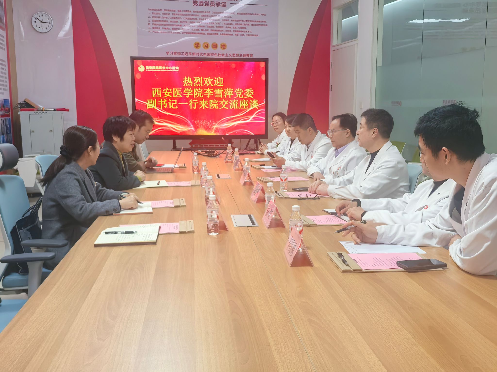 会上,贺西京对李雪萍一行表示热烈欢迎。他高度肯定学校办学水平与人才培养质量,详细介绍了医院发展历程、学科建设成效及特色诊疗优势,表示医院与学校有深厚的合作渊源和坚实基础,希望以此次交流为契机,进一步深化校院全方位合作,聚力协同育人,联合培养更多高素质应用型医学人才,同时热忱欢迎学校优秀毕业生加入医院,为医院高质量发展注入新生力量。医教部主任冯军强全面介绍了医院整体概况、人才队伍建设、康复医学学科发展,以及临床实践教学管理与教学质量保障等重点工作。