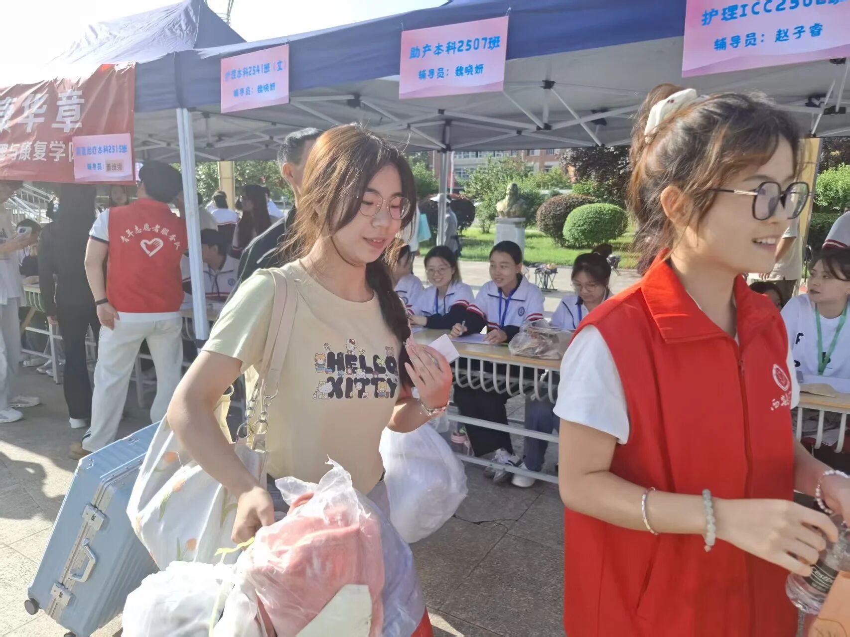 由学院团总支、学生会、南丁格尔青年志愿者服务队、青年媒体学生党支部学生志愿者组成的迎新团队,以饱满的热情和专业的服务成为校园中一道亮丽的风景线。他们统一着装、精神抖擞,为新生提供入学登记、宿舍引导、校园介绍等一站式贴心服务,充分展现了护理与康复学院学子团结友爱、乐于奉献的优秀品质,也让初入校园的新生感受到家一般的温暖。
