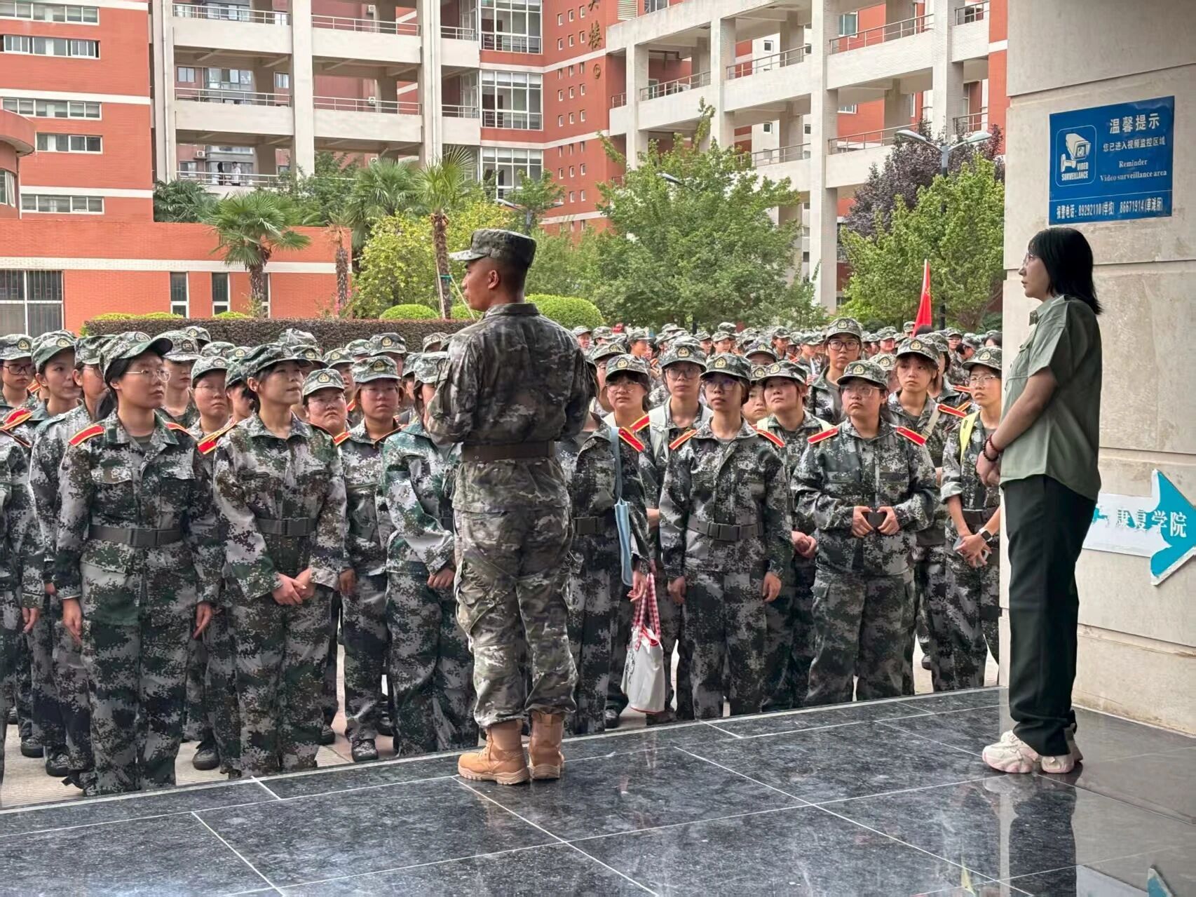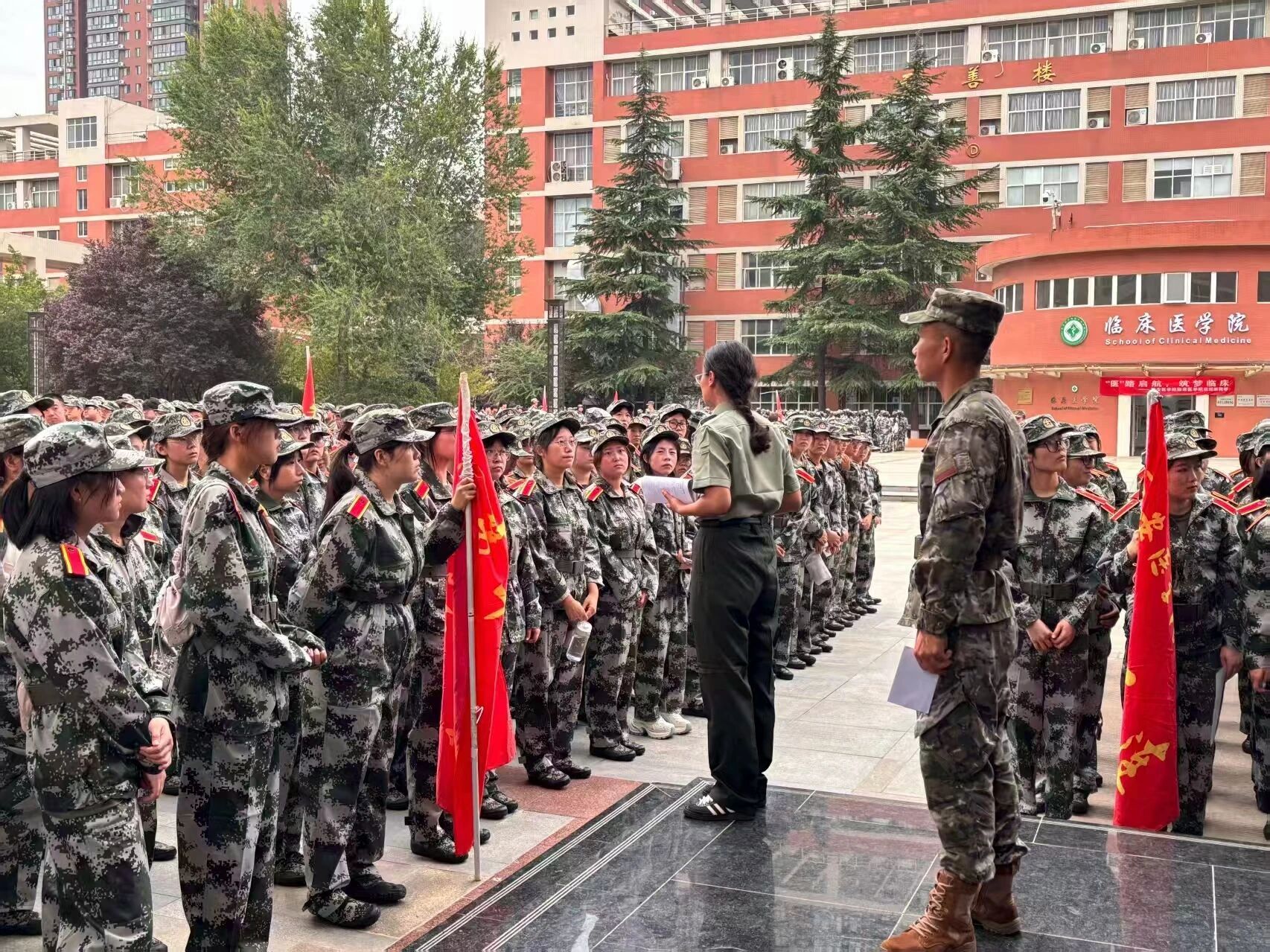 9月7日下午5时,护理与康复学院全体新生整齐列队,以热烈的掌声欢迎承训教官团队的到来。各连队教官逐一自我介绍,详细说明了军训纪律、训练标准及着装规范。辅导员寄语新生认真参训、听从指挥、注意安全,于迷彩岁月中淬炼意志、砥砺品格。现场气氛庄重而热烈,新生们用铿锵誓言回应期待,彰显出以最高标准完成军事训练、为大学生活谱写荣耀开篇的坚定决心。