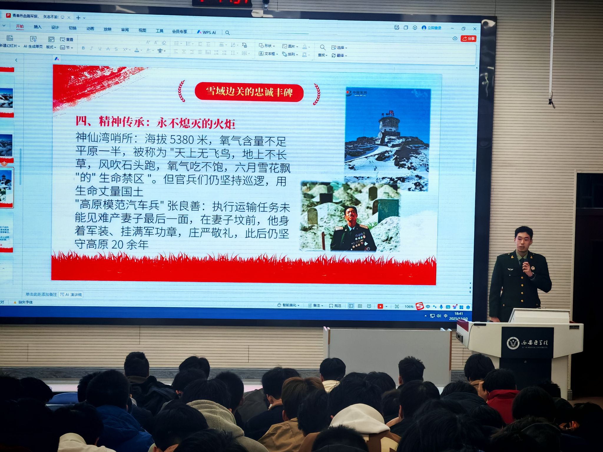 接着,退伍大学生牛苗和李辙化身“宣讲员”分享自己的军旅生活。他们讲述了在部队中从初入军营的懵懂到逐渐成长为坚毅战士的蜕变历程,分享了训练场上摸爬滚打、执行任务时的责任担当,以及收获战友情谊的珍贵瞬间。他们还分享了退伍后的学业衔接与职业发展规划,谈到如何将军营中淬炼出的纪律意识与坚韧品格,转化为赋能未来人生的宝贵财富。这些真实鲜活的故事,不仅让同学们深切领略到军旅生活的独特魅力与军人的使命担当,更赢得了现场阵阵热烈的掌声。