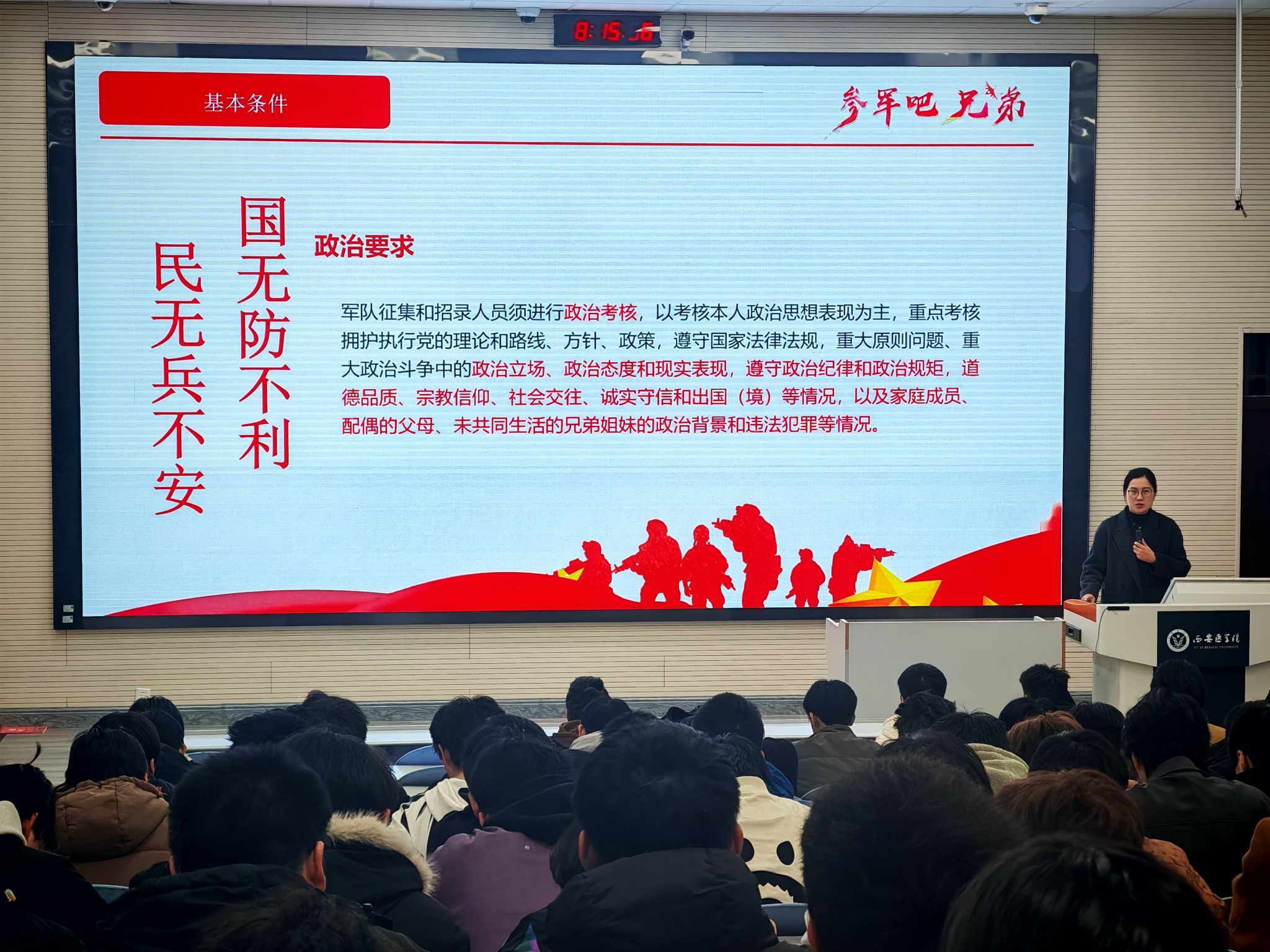 宣讲会伊始,王秋燕老师围绕2026年上半年征兵工作展开核心政策的全面解读。她从报名流程、体检标准、政治审查等关键环节切入,结合最新政策文件与往届学子参军案例,系统梳理了大学生专属的学费补偿减免、考研加分等优待政策,同时着重提醒同学们关注体检重点事项,让在场同学对参军入伍政策有了直观且深入的认识。